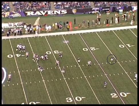 Before the snap, we see the Texans line up in an I formation, with TE Owen Daniels (81) in line to the left. WR Kevin Walter (83) comes in motion to a tight slot formation prior to the snap. The Ravens counter with an eight man front, with the right corner reduced to the line of scrimmage as a force run defender. Neither safety can be seen on screen prior to the snap and the left corner, who was playing well off Walter prior to the motion, has rotated off screen as well.