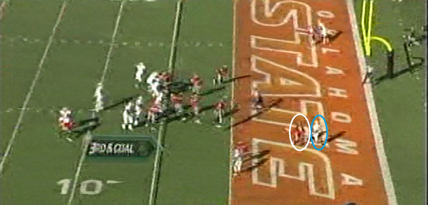 Although the Oklahoma State safety doesn’t bite on the subtle inside move, the real problem isn’t the set up of the break in this tight space, but the actual break Wright executes in the right flat. When break inside or outside a receiver should keep his path flat or angled back to the quarterback once he’s out of his break because this allows him to accomplish two things: