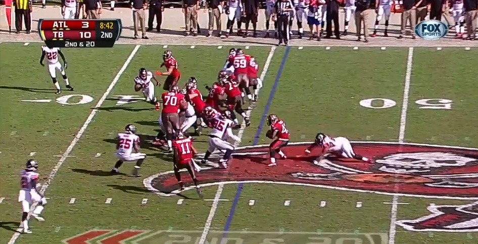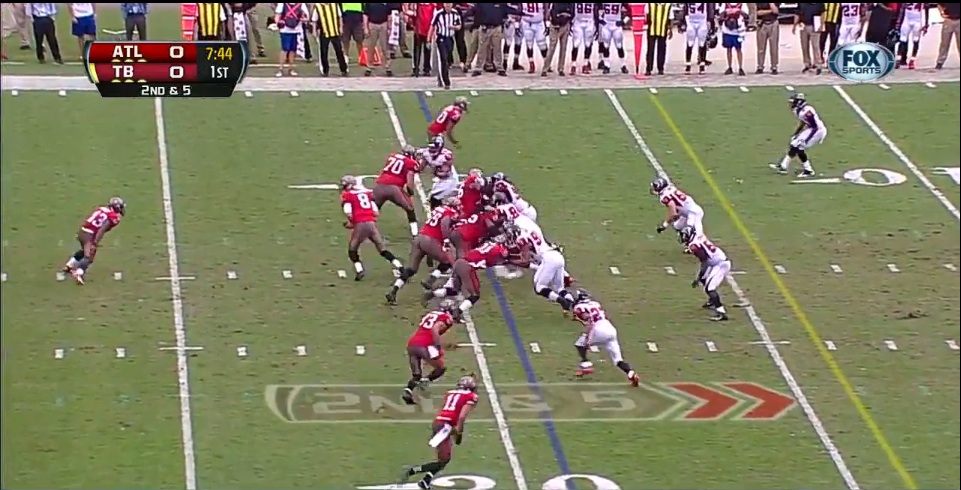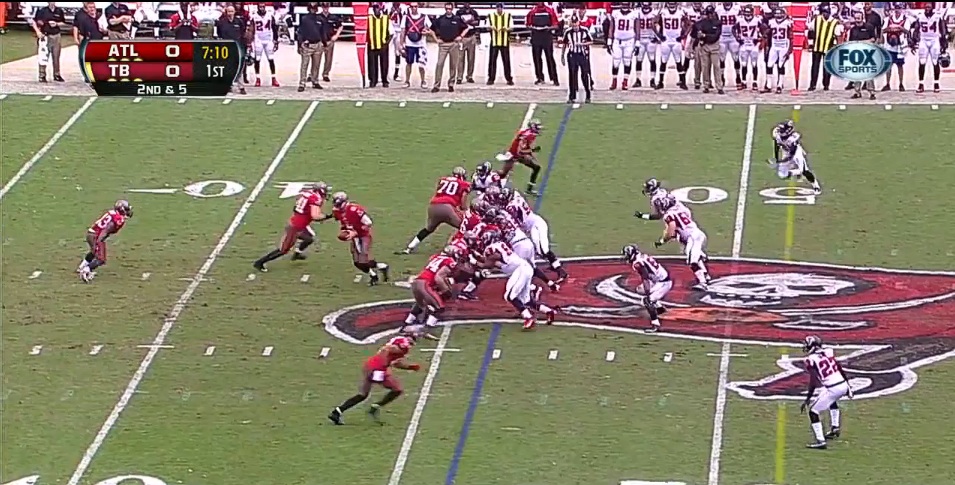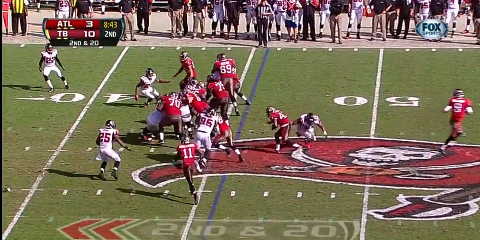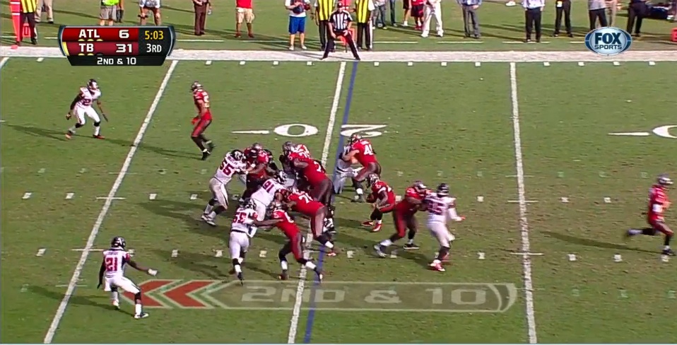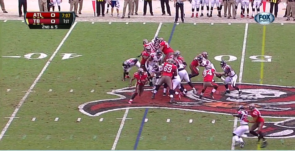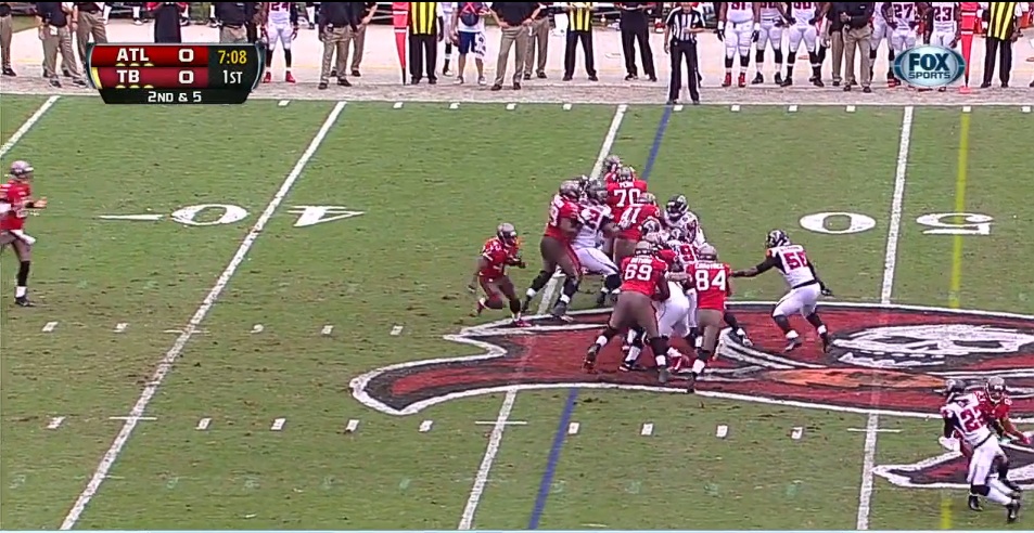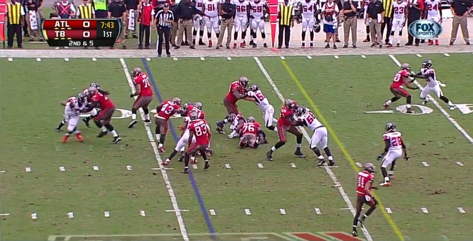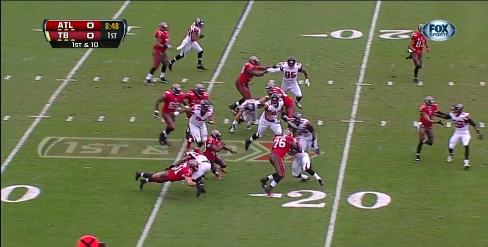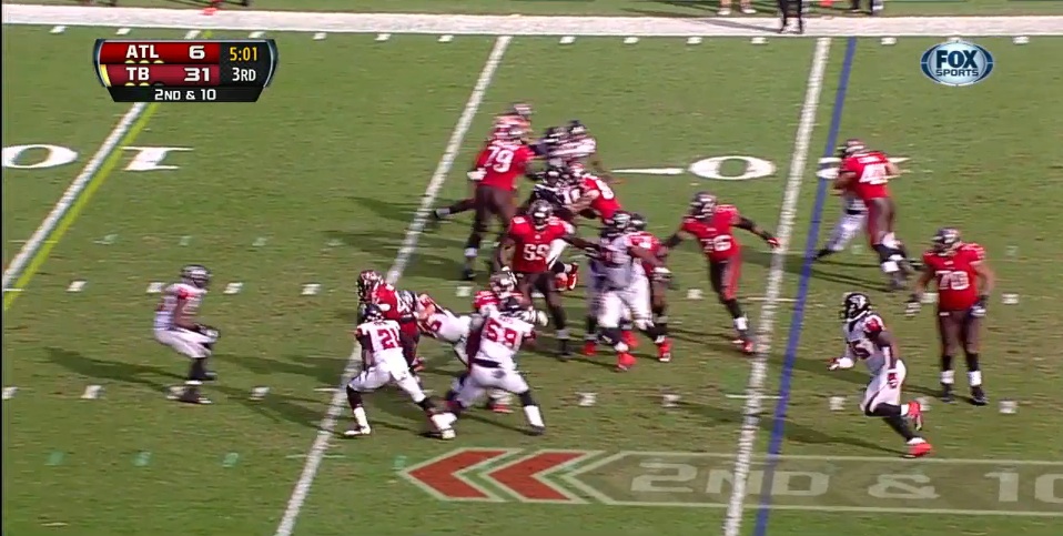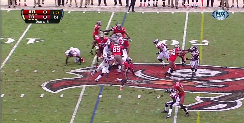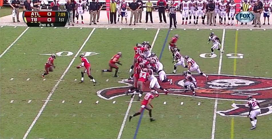 This time around, the Tampa line does a good job sealing the Falcons’ line to the left side.