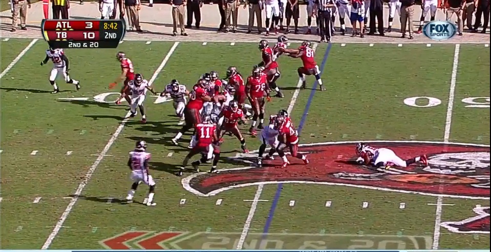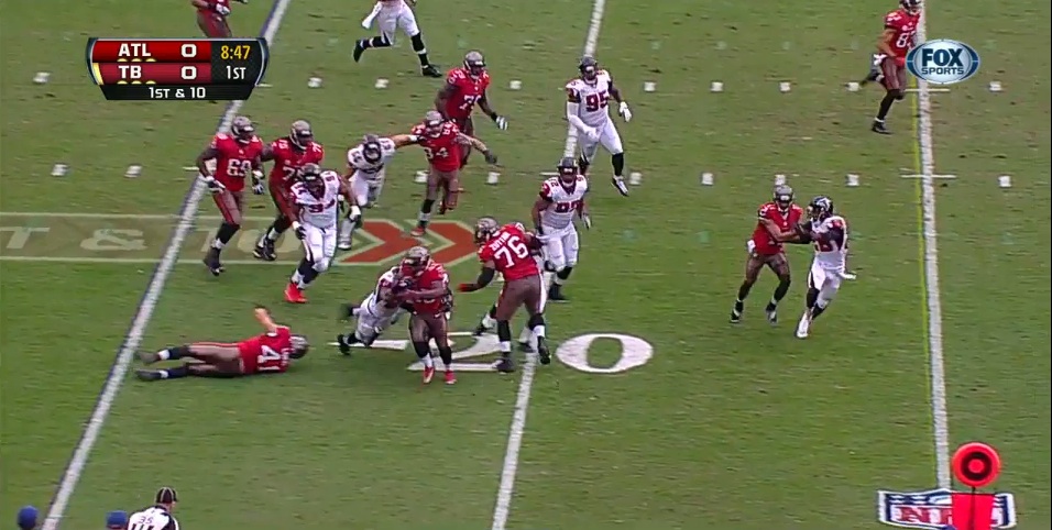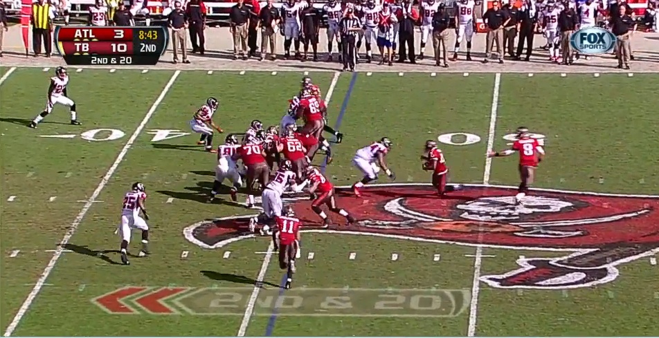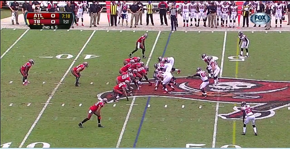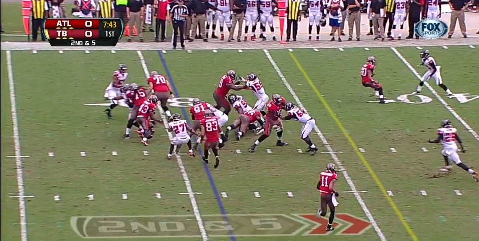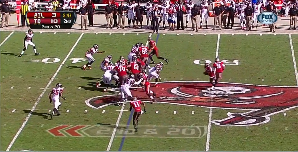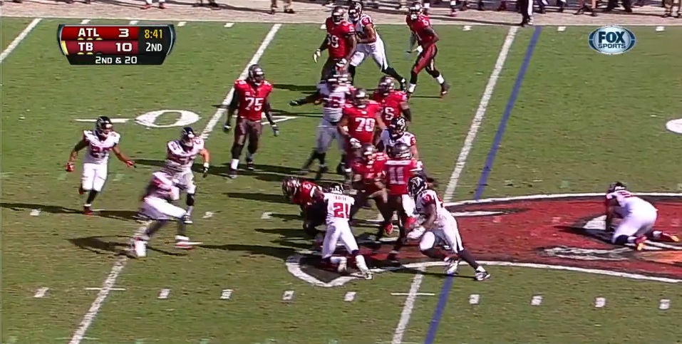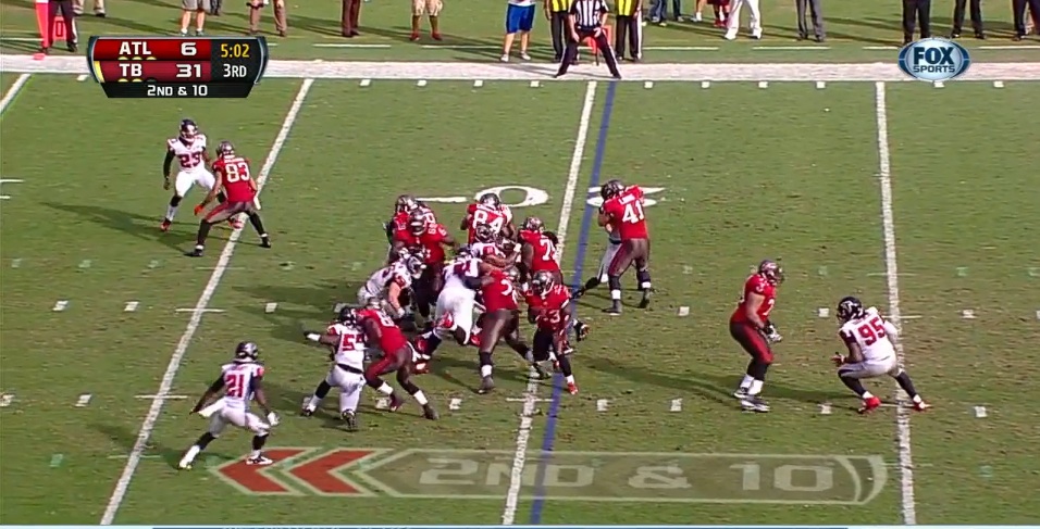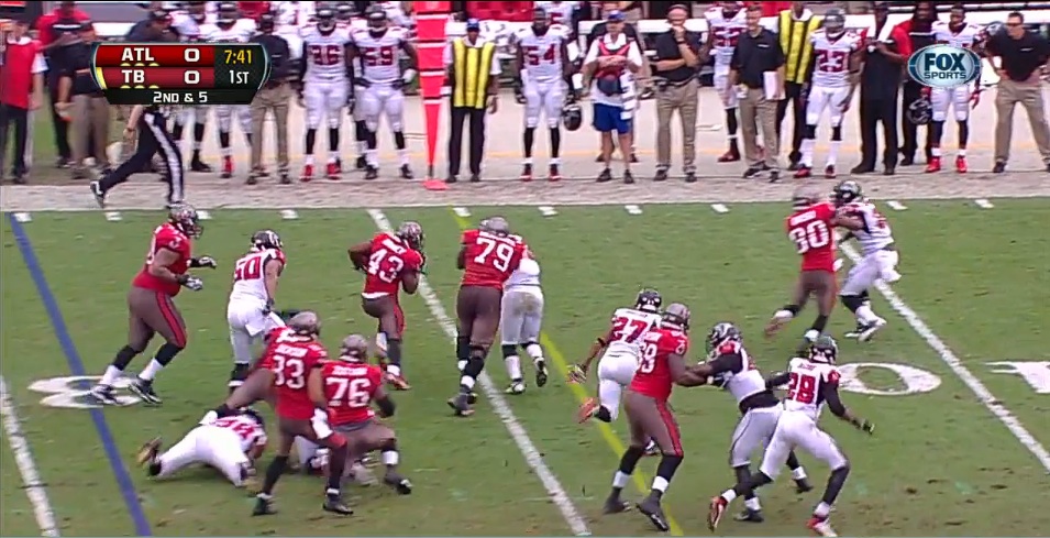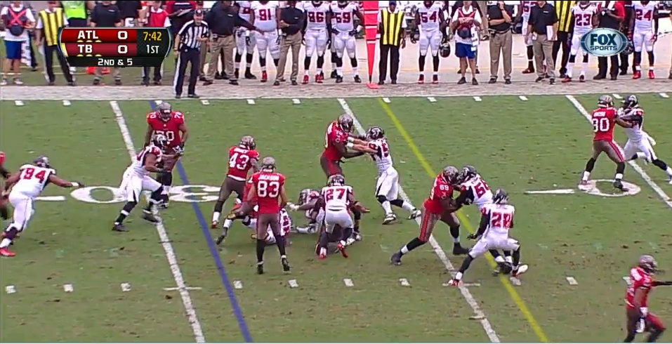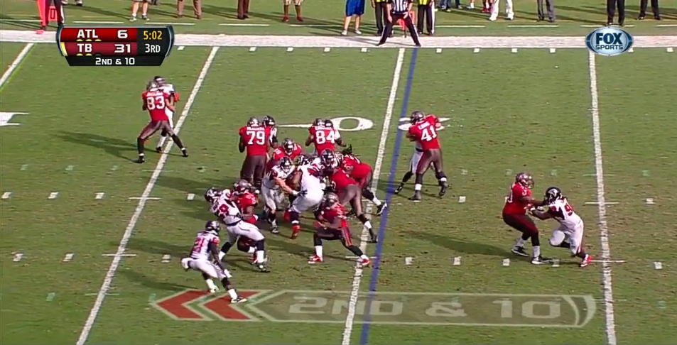 This time around, the Tampa line does a good job sealing the Falcons’ line to the left side.