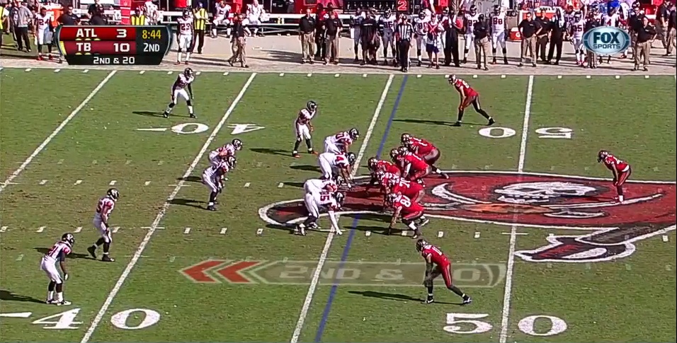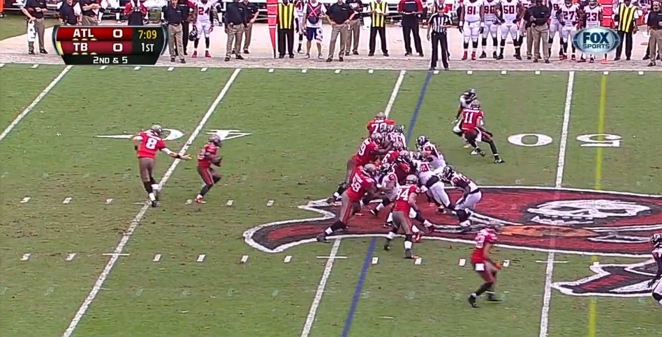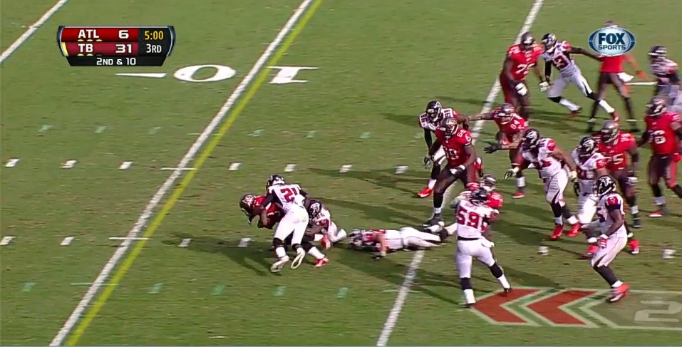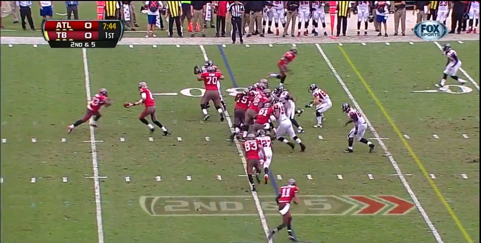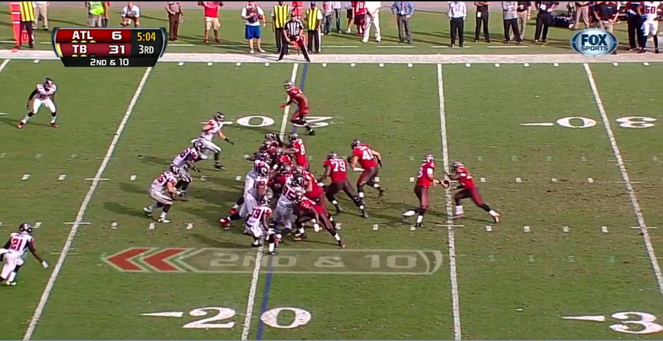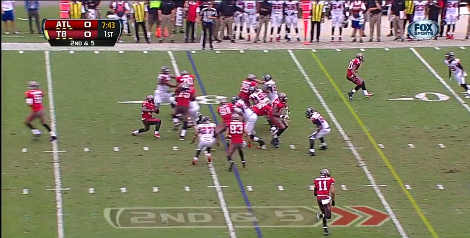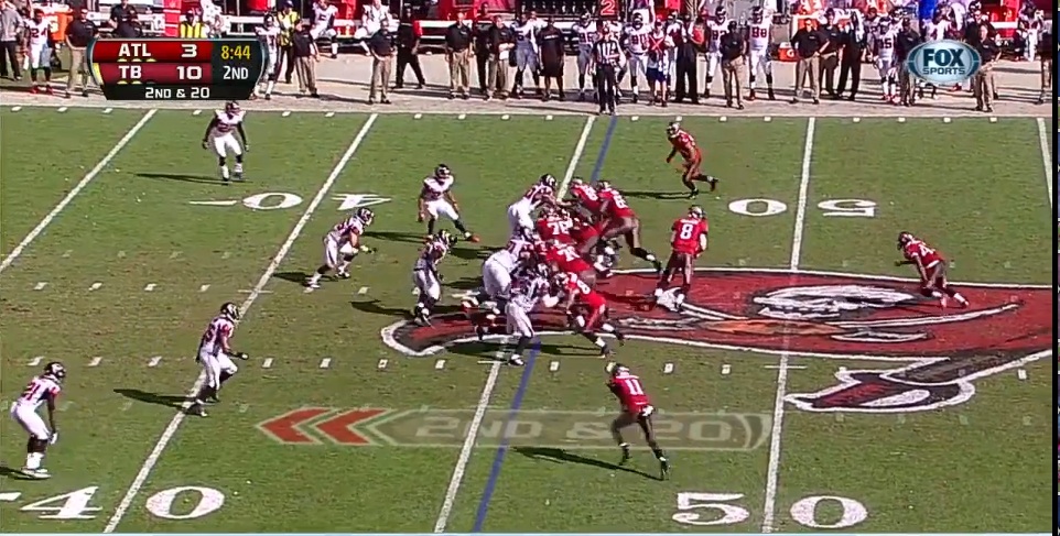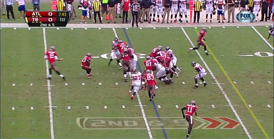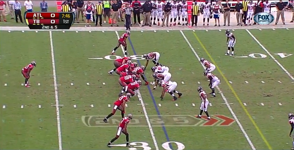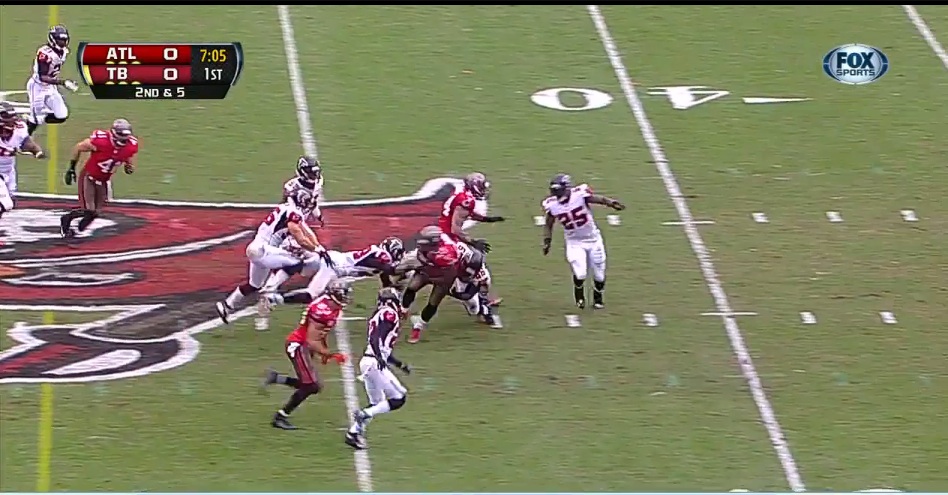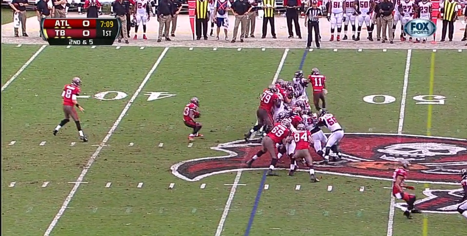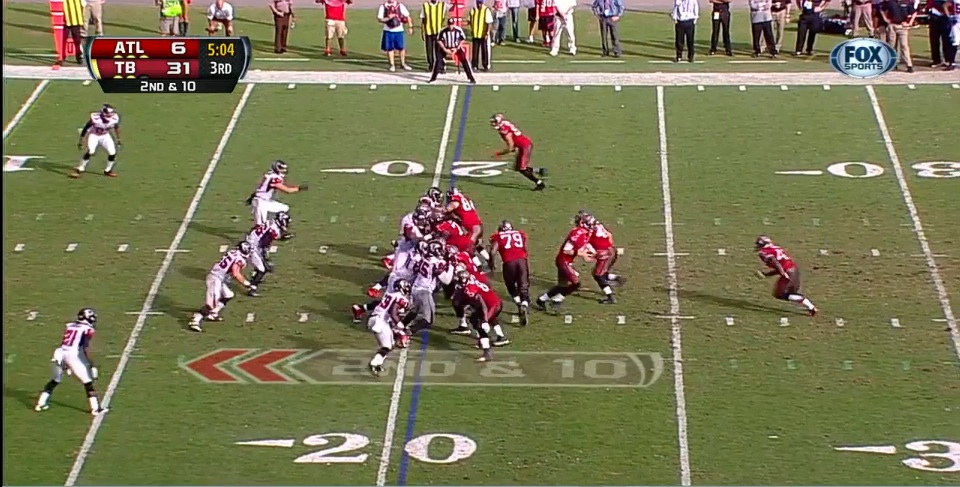 This time around, the Tampa line does a good job sealing the Falcons’ line to the left side.